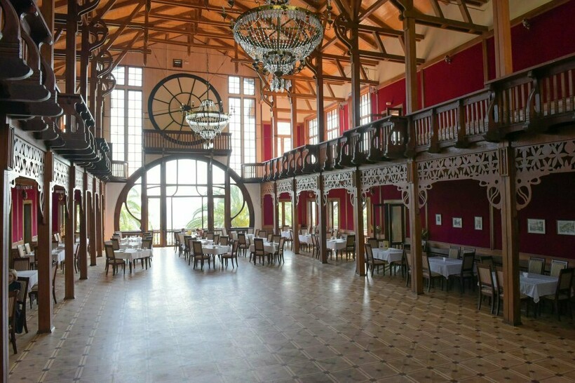 - Ресторан «Гагрипш» — знаменитое строение без единого гвоздя. Добраться до него несложно, огромные часы на фасаде ресторана видно даже с набережной. Вход в ресторан бесплатный, можно наслаждаться интерьером сколько угодно. Но если решите пообедать, знайте, что средний чек там составляет 1500–2000 рублей с человека.