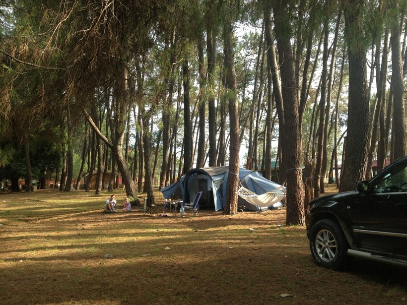В сосновой роще располагаются путешественники с палатками.
