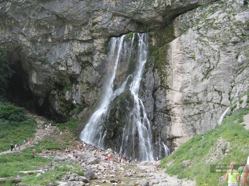 Гегский или Черкесский водопад, самый известный в Абхазии. Высота 60-70 метров. Очень красивый, зрелищный. Вода падает прямо с отвесной скалы. На личном легковом авто подъехать вряд ли удастся, дорога - очень опасный узкий серпантин. Проще всего совершить приятную пешую прогулку (около 6 км.). Хотя местные возят туда на машинах с повышенной проходимостью типа УАЗ.