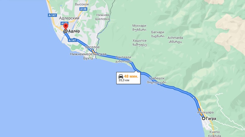 На автомобиле расстояние между городами Адлер и Гагра можно преодолеть следующим образом:
