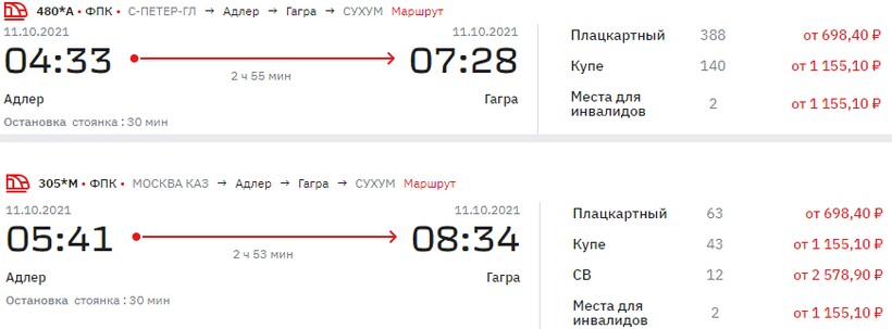 В мае — августе ежедневно по маршруту Санкт-Петербург — Сухум следует поезд № 480А, на котором можно выехать с адлерской станции в 04:33 и прибыть на гагрскую в 07:28.