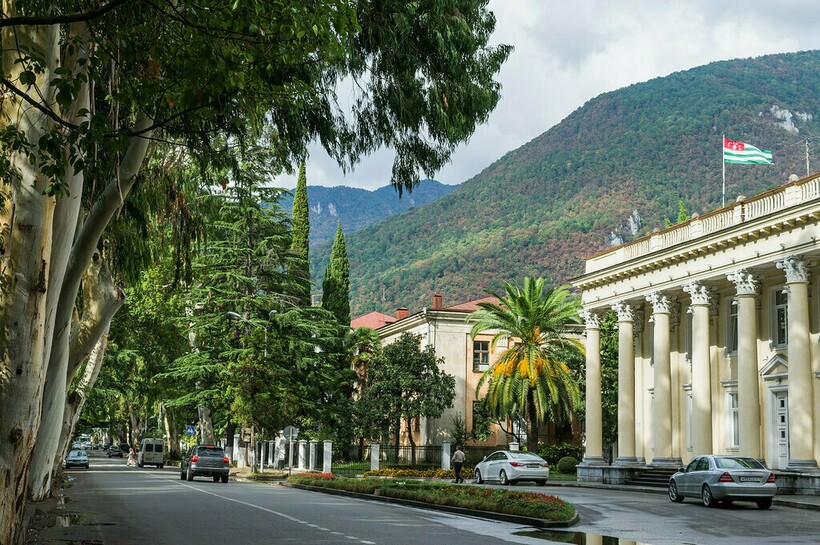 Широкие аллеи Парка Славы — мемориала воинам, павшим за независимость Абхазии в 90-е годы прошлого столетия — можно увидеть со стороны набережной. В глубине парка установлен памятник первому президенту Владиславу Ардзинбе.