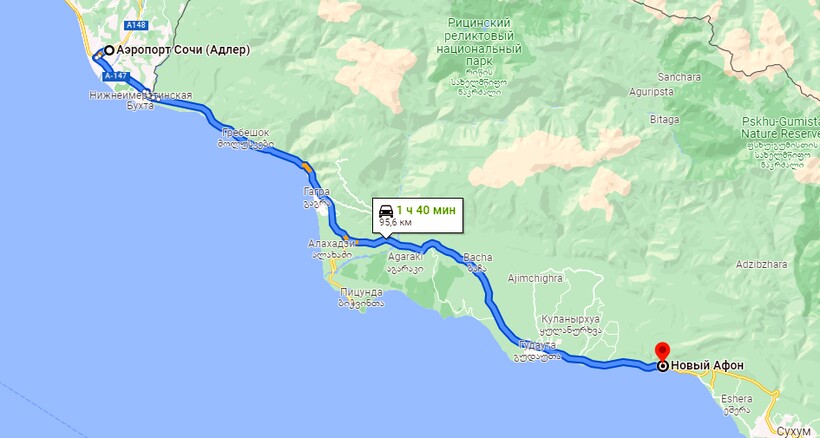 Адлер и Новый Афон разделяет расстояние в 100 км. Маршрут проходит через Кавказские горы вдоль черноморского побережья и пересекает российско-абхазскую границу. Преодолеть путь между городами в среднем можно за 3 часа. Самые оптимальные варианты того, как добраться до Нового Афона из Адлера — на поезде, автобусе и автомобиле.