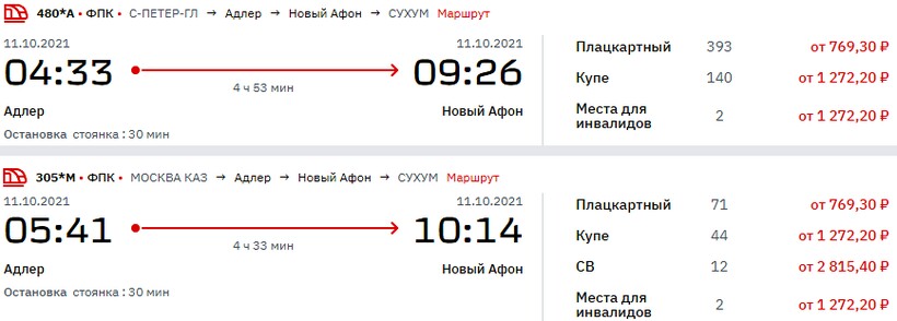 - в апреле — октябре отправляется ежедневно с вокзала Адлера в 05:41 и прибывает на новоафонскую железнодорожную станцию в 10:14;