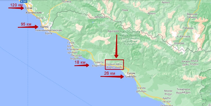 Ближайший крупный российский город к новоафонскому побережью — Сочи, который находится в 120 км. Расстояние от Адлера до абхазского курорта составляет 95 км.