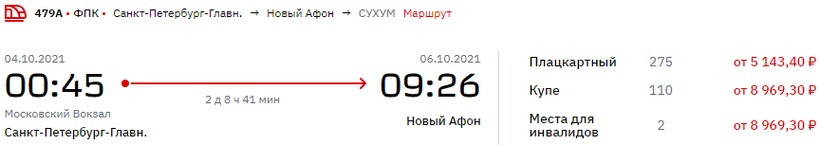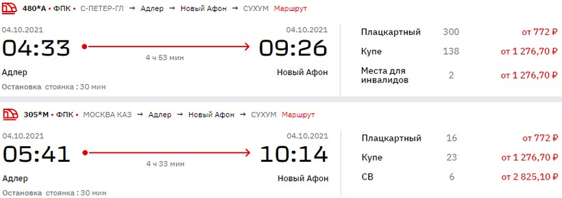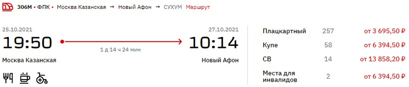 Круглогодично из российской столицы до курортов Абхазии можно доехать на пассажирском составе № 306М/305М Москва — Сухум. С середины апреля по ноябрь поезд курсирует ежедневно, в ноябре — апреле — один раз в 4 дня. Отправляется состав с московского Казанского вокзала (находится на Комсомольской площади) в 19:50 и через 38 ч. прибывает на новоафонскую станцию — в 10:14. Билеты — от 3700 ₽.