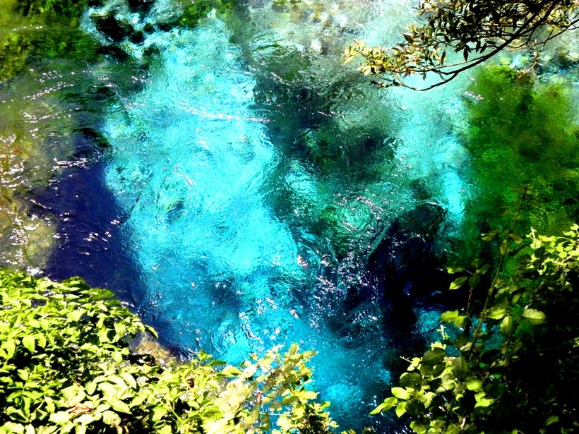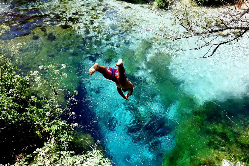 - Прыгнуть в "Голубой глаз". На территории большого природного заповедника недалеко от города Саранда можно увидеть удивительное явление — карстовые источники. Бьющая глубоко из-под земли вода вырывается наружу с красивым бурлением, а ее цвет — нежно-лазурный на фоне темно-синего цвета в глубине, при взгляде сверху похож на "око", оттуда и пошло название. Маленькая деревянная пристройка позволяет совершить прыжок прямо в источники. Источники очень глубокие и даже специально нырявшие для измерения глубины дайверы не смогли достигнуть дна. А вот температура воды взбодрит, весь год она сохраняет температуру около +13 градусов. Правда, я всегда любила в августе немного охладиться и прыгнуть в воду. В каждый последующий заход она уже не кажется такой уж холодной.