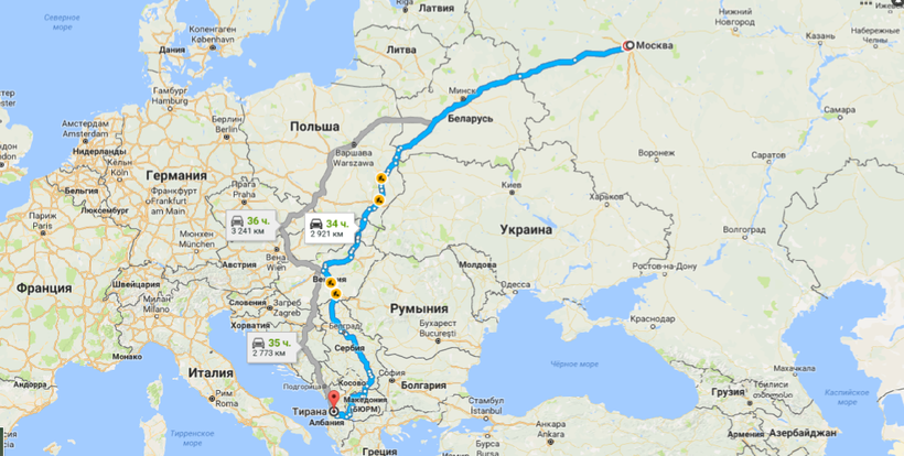 Путь из Москвы в Тирану — это чуть меньше 3000 километров. В пути с учетом ночевок придется провести два-три дня. Большая часть маршрута совпадает с дорогой до Будапешта, поэтому о деталях и нюансах этого пути можно прочесть в обзорной статье о Будапеште. После Будапешта есть два варианта продолжения пути. Первый через Хорватию, Боснию и Герцеговину, Черногорию. Второй — через Сербию и Македонию. Во всех упомянутых странах кроме Черногории предусмотрена плата за дороги в зависимости от длины пройденных участков. Со всех точек зрения, второй вариант оптимальнее: меньше плата, удобнее рельеф и самое главное — меньше пересечений границ. Собственно границы являются самой большой проблемой автомобильного пути в Тирану и чем меньше границ, тем меньше время в пути. При выборе второго варианта, воздержитесь от соблазна сократить путь через территорию Косова. Хотя этот маршрут короче, неурегулированность государственных границ может создать бюрократические сложности.