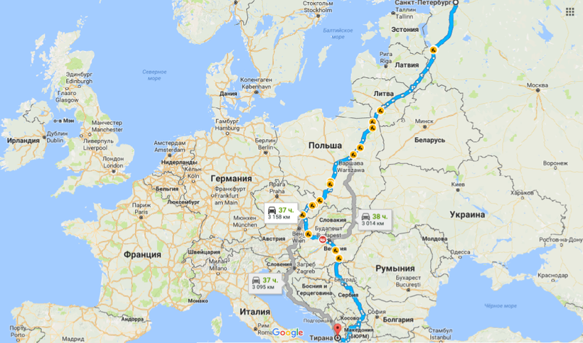 В случае пути из Санкт-Петербурга дорога займет больше времени, так как протяженность пути больше 3000 километров. В целях безопасности пути, советую устроить минимум две ночевки (например, в Варшаве и Белграде). Из трех возможных маршрутов самый оптимальный — это тот, который отмечен на карте синим цветом. В этом маршруте лучшее соотношения стоимости дорог, их качества, рельефа местности и количества пересекаемых границ.