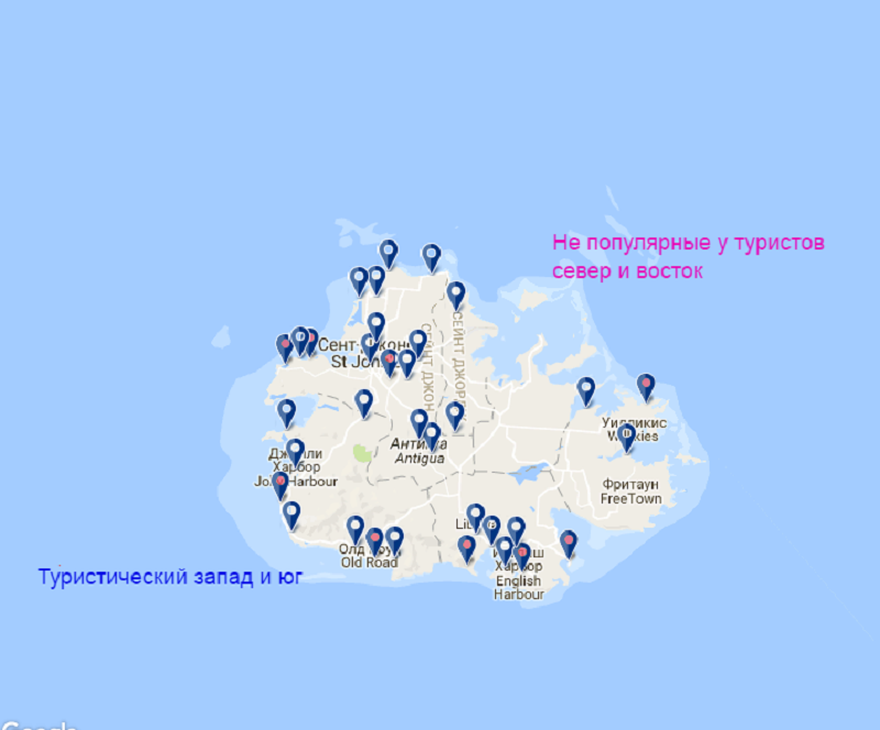 Государство состоит из нескольких мелких и двух больших островов – Антиги и Барбуды. Да, именно Антигой местные называют главный остров. Барбуду же принято называть Барбьюдой, но мне привычнее на английский манер. Третий по величине остров государства – необитаемая Редонда.