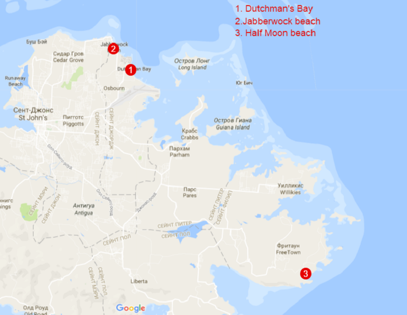 - Half Moon Beach – огромный пляж с розовым песком и сильными волнами. Идеальное место для серфинга. Находится в 5 минутах езды от деревни Freetown на северо-востоке Антигуа. В трех минутах ходьбы от пляжа есть ресторан, который работает с переменной постоянностью. Берите еду и напитки с собой.