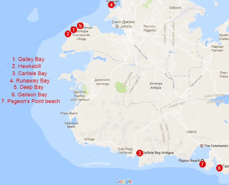 - Pigeon’s Point beach – пляж-двойник Galleon beach. Находится в пяти минутах езды от гавани English Harbour. Его одинаково горячо любят и местные жители, и туристы. При этом местность не развращена отельными застройщиками. Вдоль дороги есть несколько уютных местечек, где можно недорого и довольно вкусно перекусить.