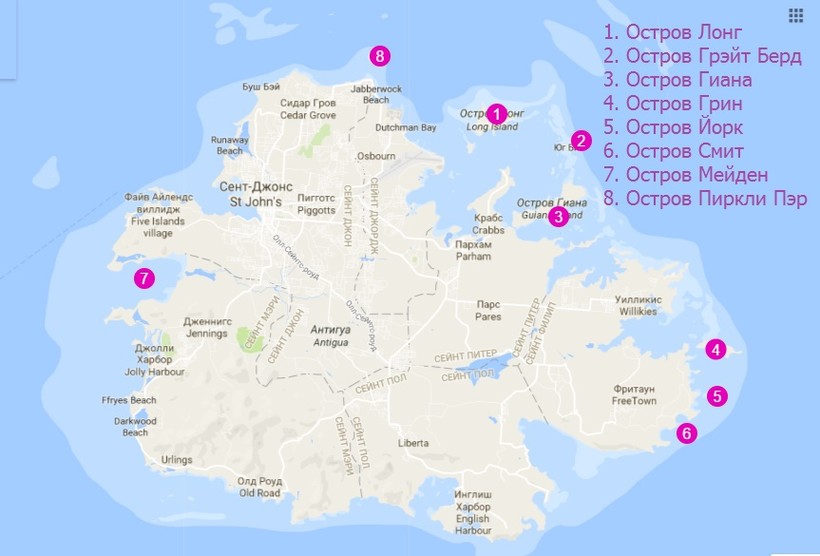 Антигуа. Его площадь составляет всего 280 кв. км. Для сравнения: столица Татарстана – город Казань – имеет площадь в 520 кв. км. Антигуа меньше Казани в 1,5 раза! Если у вас будет машина, то вы сможете спокойно за один день несколько раз объехать Антигу по периметру. Остров разделен на шесть 6 округов – Сент-Питер, Сент-Филип, Сент-Джордж, Сент-Джон, Сент-Мэри, Сент-Пол. В каждом округе есть своя столица. Но они больше похожи на богом забытые деревушки.