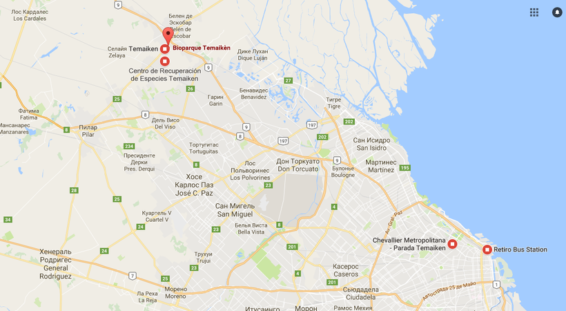 Автобусы приезжают на центральный терминал Retiro, который находится на побережье лагуны недалеко от центра. До любой точки города из него можно добраться на общественном автобусе.