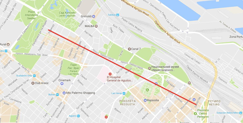 Автобус сделает много-много остановок в городе, в том числе и в центре. Либо следите за перемещением по навигатору, либо спросите нужную остановку у водителя такси или персонала отеля/хостела. Конечная станция — вокзал Retiro, откуда можно добраться до любой точки города на метро.