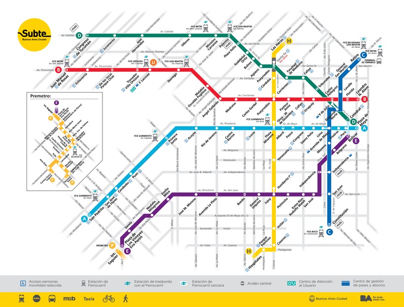 Subte, как здесь называют метро, покрывает не весь город, а только центральную его часть и имеет шесть линий, обозначенных цветом и буквами.