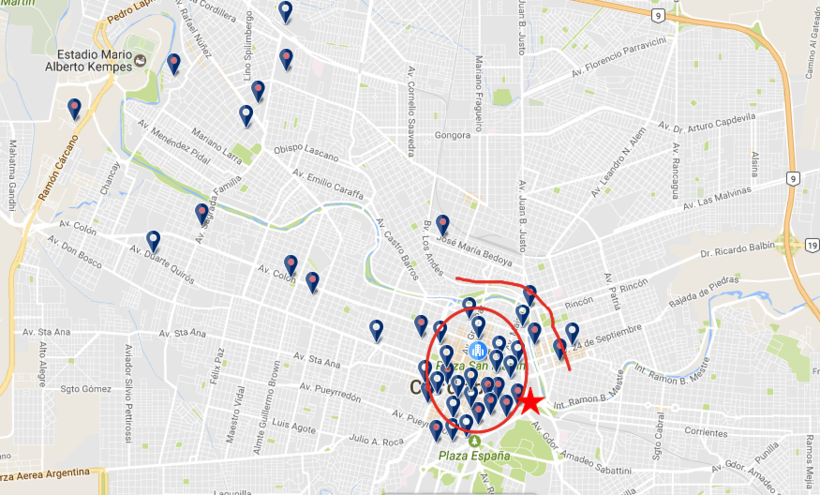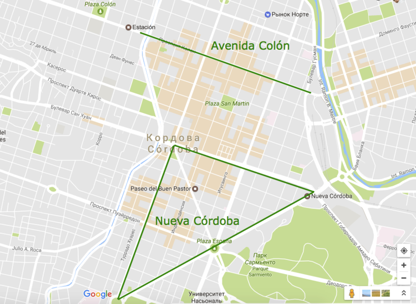 Традиционно считается, что Кордоба безопаснее, например, Буэнос-Айреса или Росарио. В любом случае я НЕ рекомендую селиться далеко от центра города вдоль реки (линия) там может быть небезопасно в будние дни (в выходные там тусовка, так что спокойнее). Как вариант, если вы молоды и горячи, приехали с друзьями (желательно аргентинцами) повеселится и походить по местным барам, то этот вариант заселения сэкономит вам немного денег на коктейли.