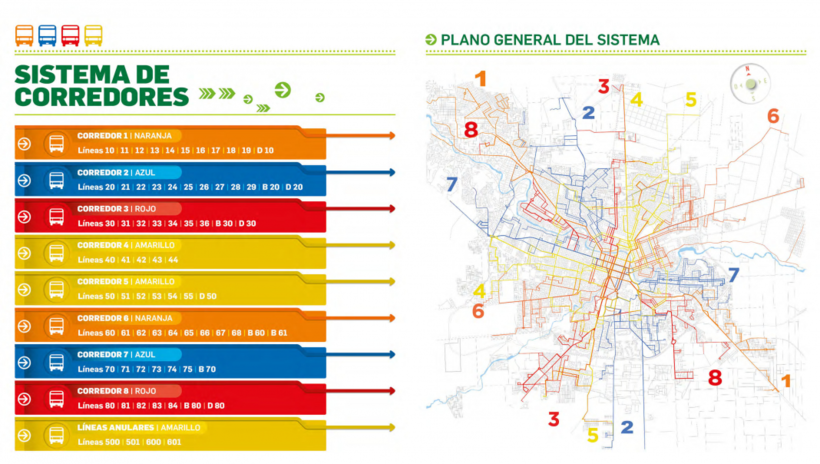 Есть несколько линий автобусов, они разделены на «коридоры», каждый из которых связан с цветом и буквой: