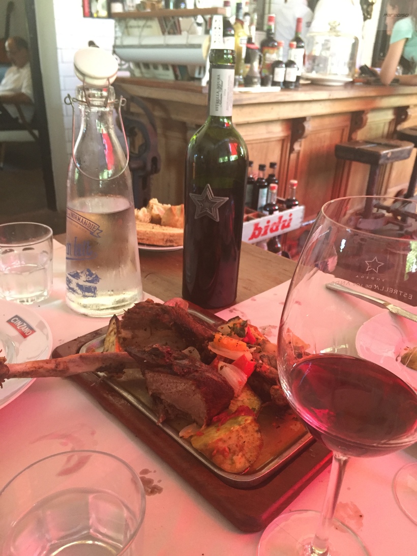 Ну как здесь не поесть? Решили заказать вино и десерт, и тут мимо пронесли ЕЁ. Ногу. Прекрасную запеченную ногу какого-то животного, которое было идентифицировано нами, как козленок. Десерт был немедленно отменен, белое вино нещадно выпито в качестве аперитива. Как оказалось это chancho – гугл транслейт говорит, что это свинья, но я то точно знаю, что свинья на испанском или аргентинском – это cerdo. По вкусу мясо было мало похоже на свинину, это было очень-очень вкусно…