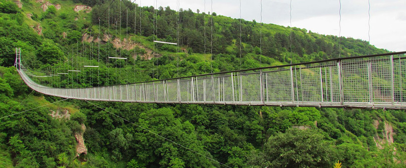 - Древние пещерные жилища в селе Хндзореск. До села Хндзореск и расположенного неподалеку города Горис, туристы доезжают не часто. Расстояние в 250 км от Еревана отпугивает многих, но как же они ошибаются, ох как ошибаются! Туристов здесь действительно не много, но зато дивной, завораживающей природы хоть отбавляй! Главной достопримечательностью является уникальный трехкилометровый «пещерный город» в Старом Хндзореске. Естественные, вырубленные жителями в скалах дома были заселены вплоть до середины XX века, являясь одним из самых многочисленных сел региона. До пещерного городка можно дойти, пройдя по построенному несколько лет назад висячему над ущельем мосту, длиной 160 метров и высотой 63 метра. Прохождение, надо сразу сказать, не для слабонервных. Несмотря на прочность конструкции, мост качается, щекотя нервы. Зато зрелище – просто неописуемое!