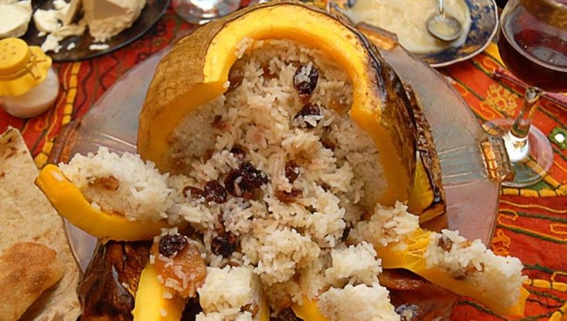- Хапама. Это блюдо интересно и приятно во всех аспектах: до того, как попробовать его сладкий вкус и аромат, вас приятно удивит его вид и подача. Хапаму готовят только в октябре и ноябре, полностью из тыквы, которая фарширована сухофруктами, рисом, грецкими орехами, морковью и яблоком. Объедение!