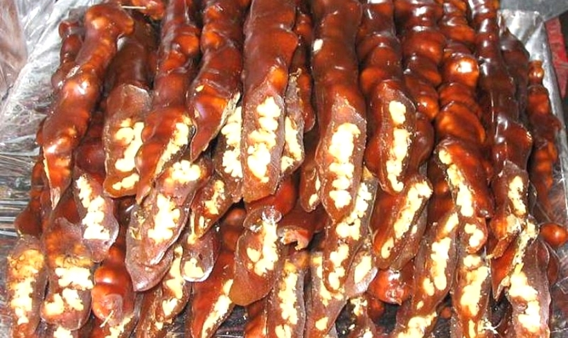 - Суджух. Еще одна невероятно вкусная сладость, которую называют «армянским сникерсом». Визуально суджух похож на грузинскую чурчхелу, но обладает более насыщенным вкусом. Он изготавливается из грецких орехов и виноградного сока.