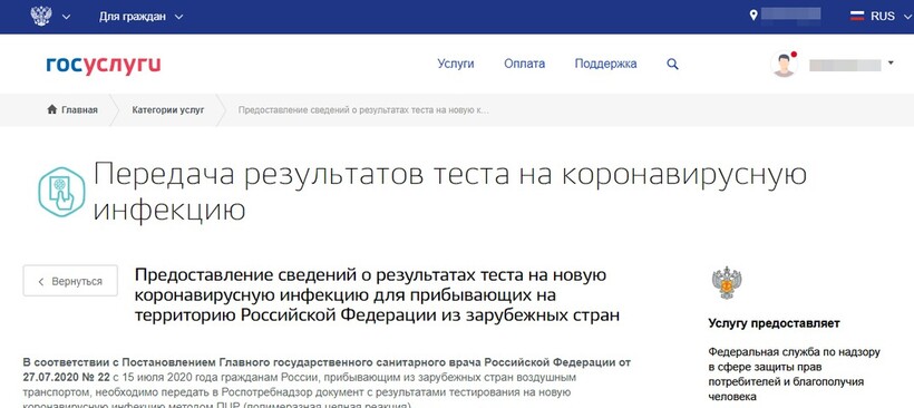 - итоги исследований следует загрузить в личный кабинет на портале госуслуг в течение 96 ч. после въезда в РФ.