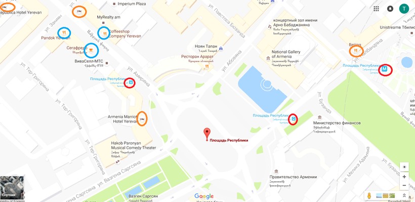 На карте вы сможете увидеть расположение и форму площади. Здесь красными кружочками я обвела ближайшие остановки транспорта и станцию метро, голубым обозначила ближайшие кафе и рестораны, а оранжевым — отели.