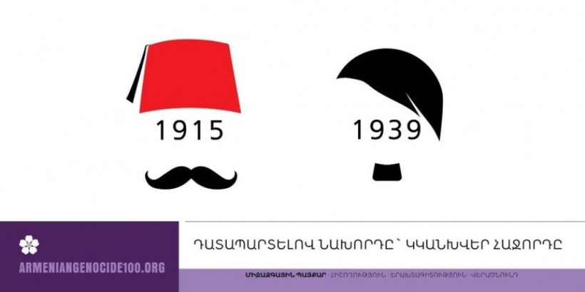 Кстати, вот один из ассоциативных баннеров, которые можно увидеть в Ереване, где со знаком равенства ставятся действия руководства Османской империи и Нацистской Германии. Здесь говорится о том, что, осуждая предыдущую трагедию, можно было избежать последующей.