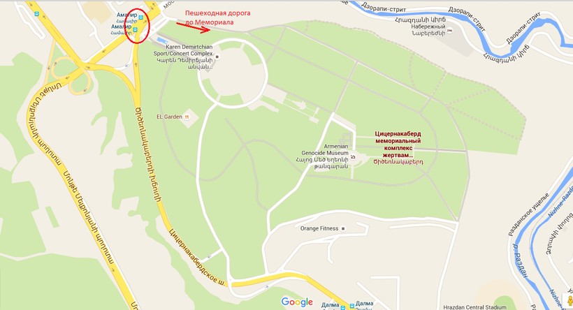 Если же вы все же добираетесь на автомобиле, то от стадиона Раздан вам нужно будет свернуть направо по Афинской улице (Атенка), и также следовать указателям прямо со стороны стадиона, или по Цицернакабердсому шоссе.