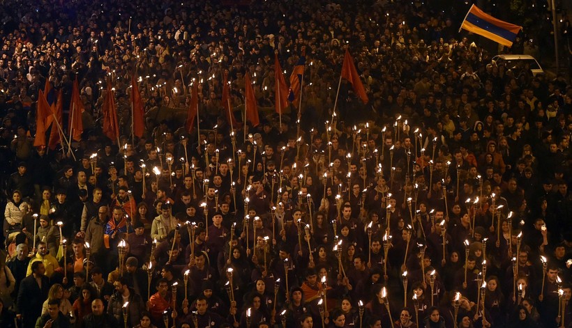 Но больше всего меня каждый год поражает шествие с факелами, которое начинается вечером 23 апреля, около 22:00 с Площади Республики, откуда тысячи жителей Еревана и других городов Армении пешком идут в Цицернакаберд, распевая патриотические песни. Шествие заканчивается в 24 апреля в полночь.