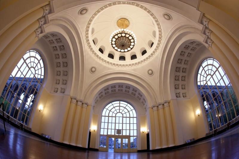 Главный вход станции – это художественно оформленный металлический витраж, окаймленный широким арочным входом.