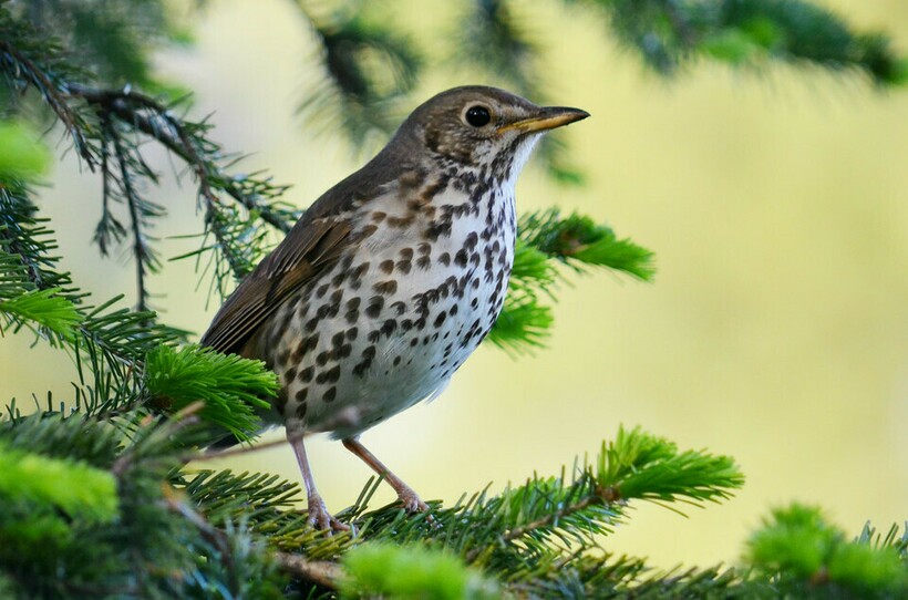 - Певчий дрозд — обладает красивым заливистым голосом, похожим на соловьиный. Имеет скромное серовато-бурое оперение с черными пестринками на грудке и брюшке. Спинка птицы покрыта темно-бурыми перьями.