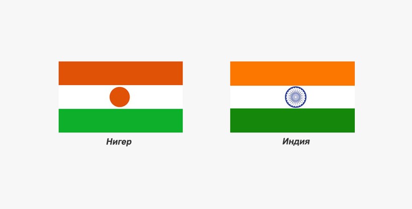 Знамена Индии и Нигера имеют схожую цветовую палитру с флагом ирландцев, но перепутать их уже труднее: их отличает горизонтальное расположение полос и геральдический символ, помещенный в центральное поле. На штандарте Нигера — темно-оранжевый солнечный диск, на стяге Индии — синее колесо с 24-ю спицами.