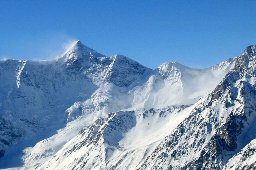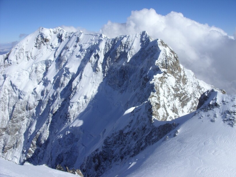 - Выход на вершинный гребень. Опасен снежными и ледовыми карнизами. В жесткий лед невозможно забить ледовые крючья, с трудом входят ледобуры.