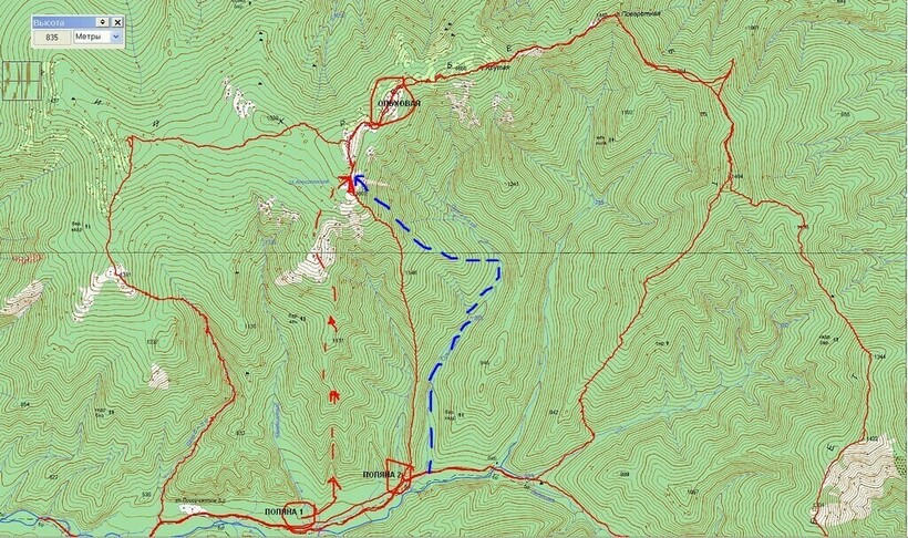 - Раньше на поляне, где берут начало основные маршруты на гору, стояло добротное зимовье, но потом оно сгорело.