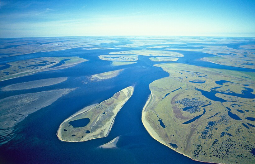 ЭТО ИНТЕРЕСНО. Дельта Лены — одна из самых больших в мире. Ее площадь — 45 тысяч кв. км. Устье ее настолько велико, что разветвляется на рукава в 150 километрах от моря.