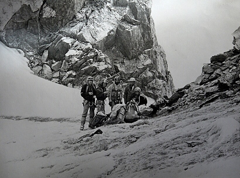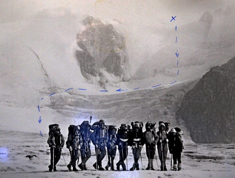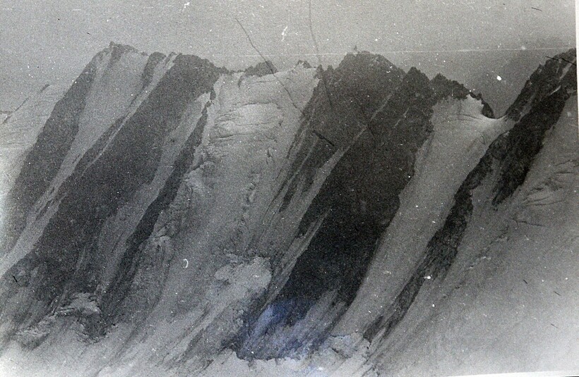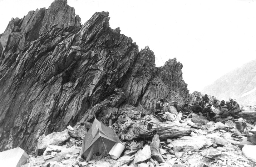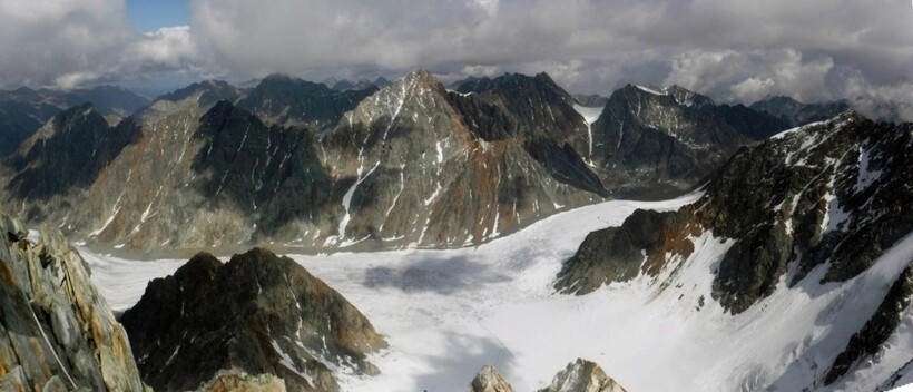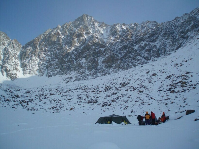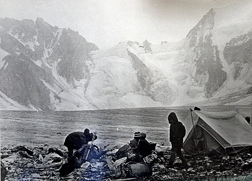 В последний день стоянки вспомогательная группа и желающие из «основы» еще раз поднялись на вершину. На этом походная программа-минимум была выполнена. Поэтому в дополнительный выход, с первопроходом сложного перевала, отправилось 6 мужчин-добровольцев. Остальная группа, собрав лагерь, встречала их в верховьях Кюретерского ледника.
