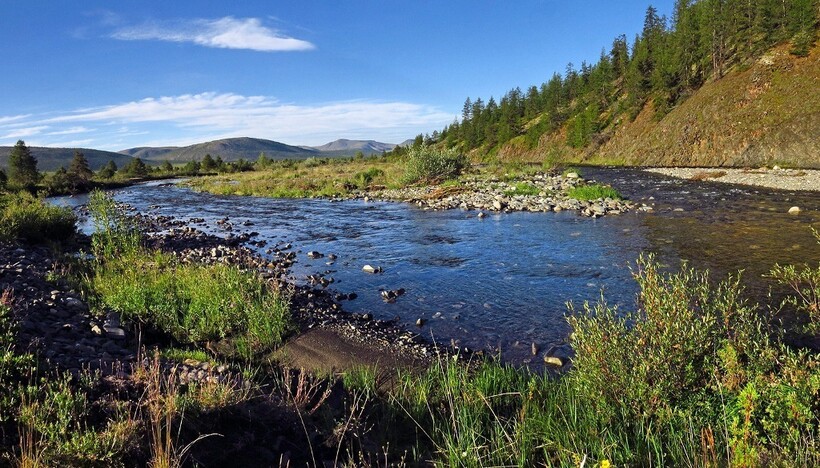 На берегах Тирехтяха появляются ивы, высокая трава, растет густой смешанный лес. В глубоких ямах с прозрачной водой стоят метровые таймени. На разливах реки гнездятся утки.