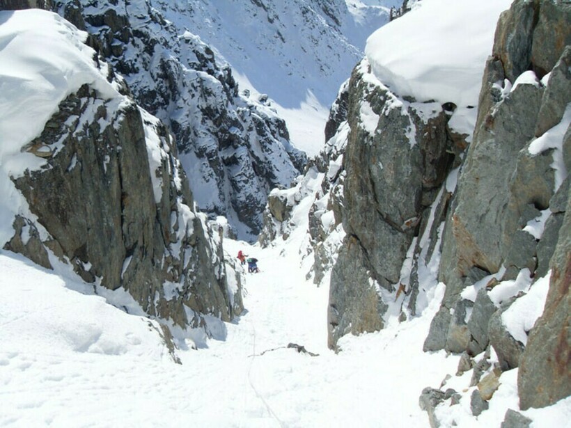 - Перевал «Ленинградский». Второе прохождение перевала «Ленинградский» для нижегородской группы упростилось, благодаря хорошему описанию группы Е. Иорданишвили. Так же как первопроходители, группа А. Частова проходила перевал (2А, 2500 м), обходя трещины ледового перегиба. Не составило сложности прохождение двухметрового бергшрунда по прочному снежному мосту. В начале спуска по узкому кулуару была навешена перильная веревка. Дальнейший спуск по снежно-ледовому кулуару крутизной до 35 градусов группа прошла с одновременной страховкой.