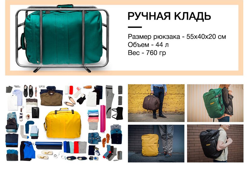 «Победа». Этот воздушный перевозчик работает по технологии лоукост: удешевляет стоимость билетов, экономя на сервисе, оказывая неполный спектр услуг, не включая в билет стоимость багажа, а в некоторых тарифах — и вовсе не дает возможности лететь с багажом. Компания разрешает взять рюкзак (в ручную кладь) в самолет, но будет строго контролировать общие габариты. Все вместе — и рюкзак, и ручная кладь должны поместиться в рамку-калибратор, которая у «Победы» меньше, чем у других авиаперевозчиков и равна 36х30х27 см.