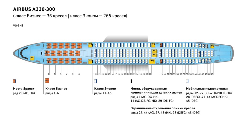 Space plus — места А, С, Н, К. Крепление для люльки малыша — в первом ряду (АС, DG, НК), 11-ом (AC, DE, FG, HK), 29-ом (DE, FG). Конструкция авиакресел в лайнере с номером VQ-BNS включает подножки и электрические розетки. Особенности остальных мест — как в варианте № 1.