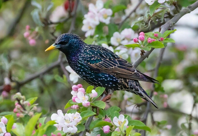 Обыкновенный скворец — это традиционный житель скворечников. Птица щебечет рядом с жилищем человека, мастерски вплетая в свой репертуар новые ноты подслушанных интонаций. Самец длиной 20–25 см носит чёрное, удлинённое на груди блестящее оперение с синим, зелёным или фиолетовым оттенком, наряд самки бледнее по цвету и с короткими перьями на грудке. Этот вид широко расселён во всей Европе и специально завезён в Австралию, Северную Америку и Южную Африку. Только северные популяции улетают зимовать на юг Европы в августе — сентябре, южные популяции живут оседло.