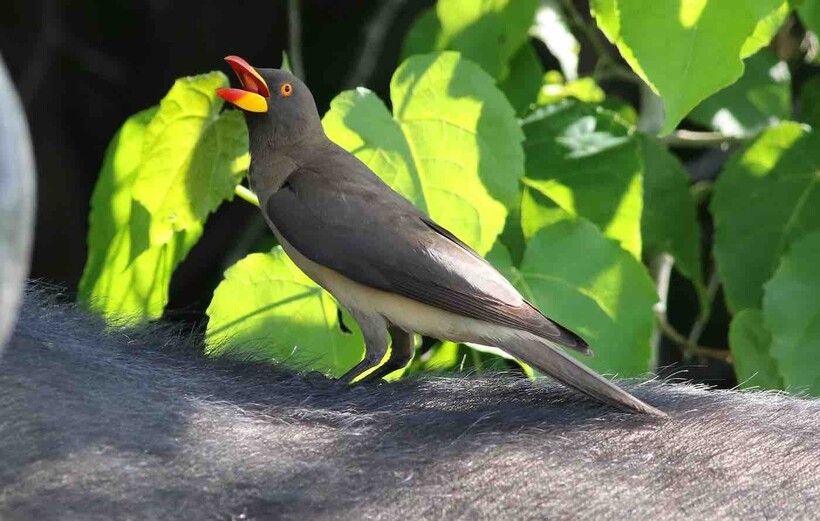 Этого скворца отличает яркий жёлтый клюв с красным окончанием и красные глаза. У него тёмный серый верх тела и более светлый низ. Обитает птица в Африке в полосе от Сенегала до Судана и кормится насекомыми, живущими на коже крупных млекопитающих. Скворцы кочуют за коровами, буйволами, а также за дикими зебрами и жирафами целыми месяцами. Птицы любят прихватить шерсть этих животных, чтобы выстелить ею дно своих гнёзд.