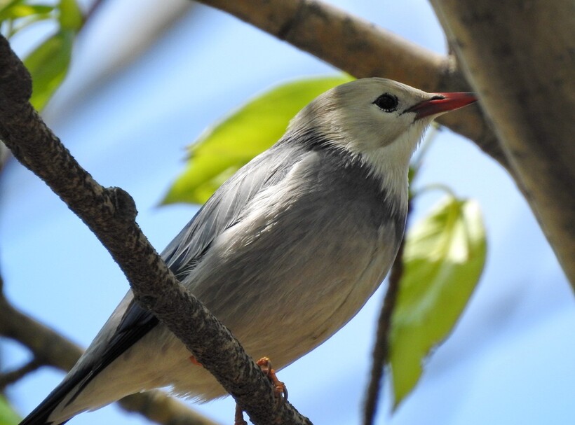 Красноклювый скворец оседло гнездится на юге Китая. Своё название получил за красный клюв, особенно яркий на фоне серого цвета тела и белых перьев на голове и брюшке. У самца перья этих частей тела удлинённые. В хвосте и на крыльях встречаются редкие черные перья. Самки бурого однотонного цвета. У красноклювого скворца довольно большие крылья при среднем 21–24 см теле. Иногда мигрирует в зимнее время во Вьетнам и Японию. Для жилья выбирает редколесья и сады, любит держаться большими стаями.
