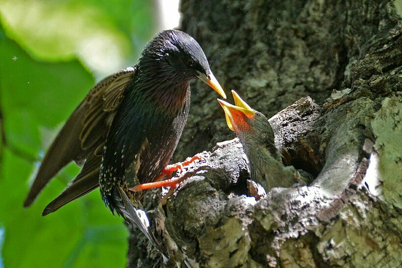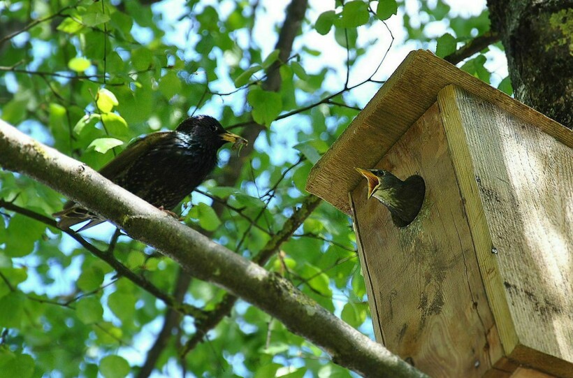ЭТО ИНТЕРЕСНО. Иногда взрослым скворцам приходится хитростью подталкивать желторотиков к первому полёту, например, выманивая их из гнезда лакомым кусочком.