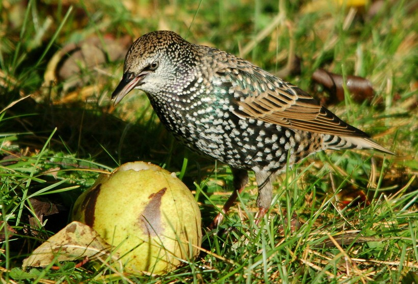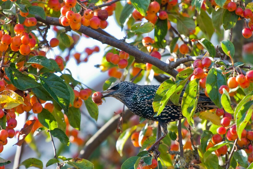 - натуральный корм: дикие плоды и семена, насекомые и личинки, которых скворец ест на воле.