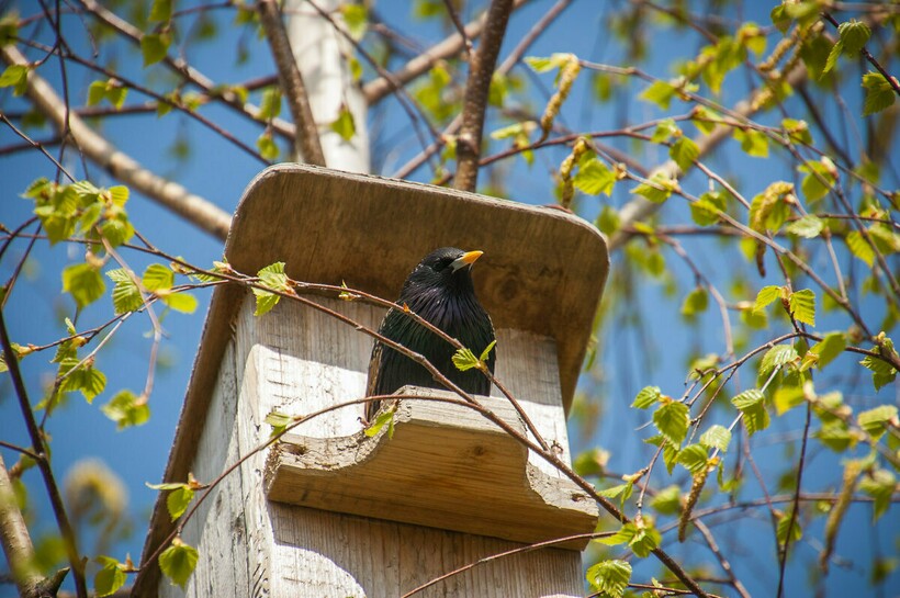 - Скворец скорее будет рад готовой постройке и поселится в скворечнике или бесцеремонно станет оспаривать занятое, например, дятлом, дупло.