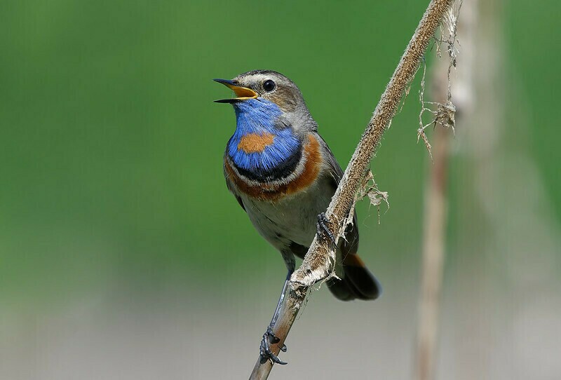 Соловей-красношейка. Эта птица размером не больше воробья. Интересная деталь внешности самцов — пятно ярко-красного оперения на горле. Вокальные данные не уступают певческому таланту восточного соловья. Часто вокализация соловья-красношейки начинается со звукоподражания голосам других птиц, его пение — выразительное и звучное, но длится недолго.
