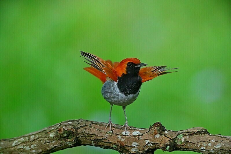 Красногрудый соловей. Размножение этого вида происходит в конце весны в Непале. Ареал включает Китай, Индию и Бангладеш. Окрас этой птицы яркий, как у многих других животных тропических лесов. Оранжевая грудка оттеняется насыщенно-синим оперением спины, головы и крыльев. Птичка с нарядным примечательным обликом — совсем не большая по размеру, длина тела составляет всего лишь 12–13 см, а максимальная масса — 16 г.